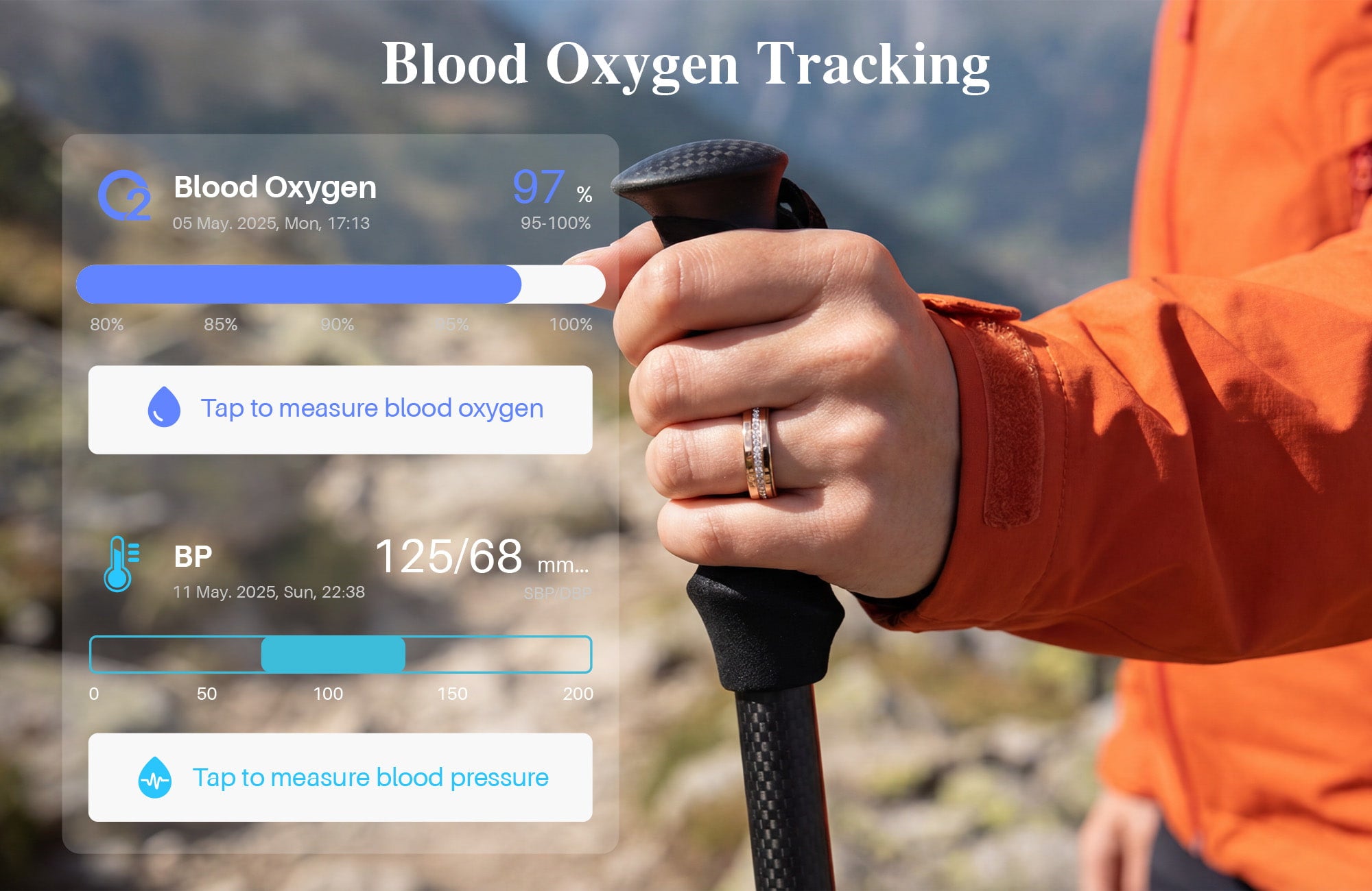 Monitor blood pressure trends and blood oxygen (SpO₂) levels to stay informed about your cardiovascular and respiratory health. Data is provided for wellness reference.