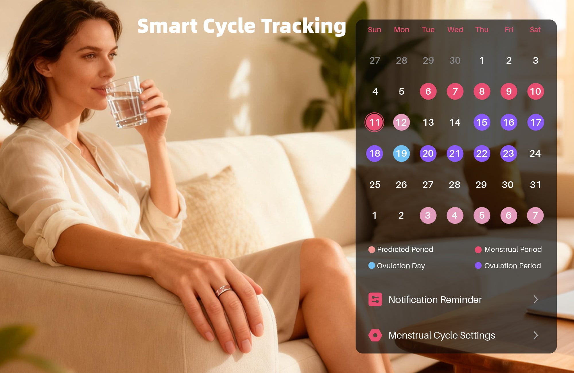Monitor your menstrual cycle effortlessly with accurate predictions and timely reminders. (Note: The function is only available when the profile is set to female mode.)