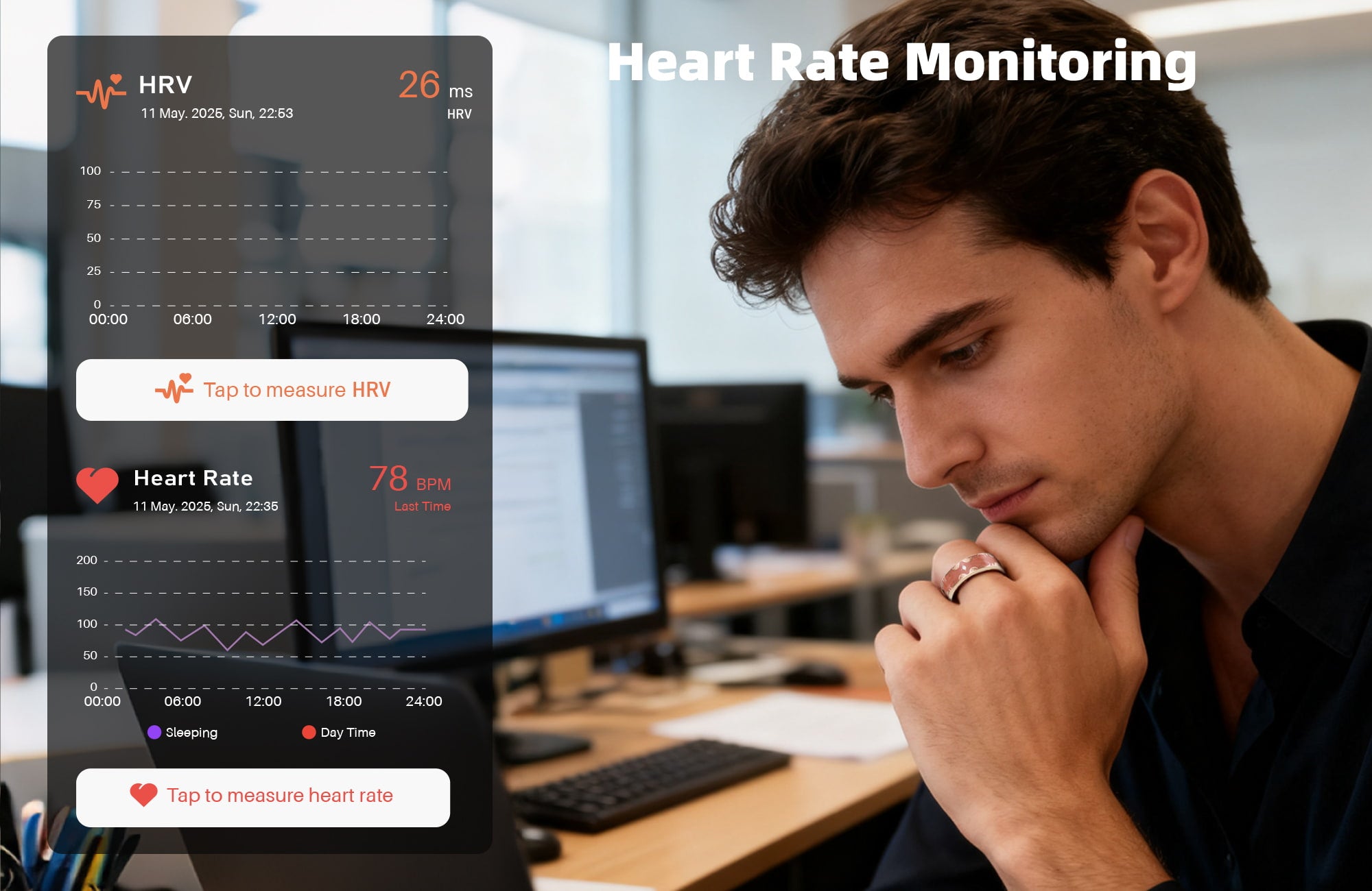 Designed for those who care about their health—especially users with underlying conditions. Monitor your heart rate and blood oxygen levels in real time, anytime, anywhere.