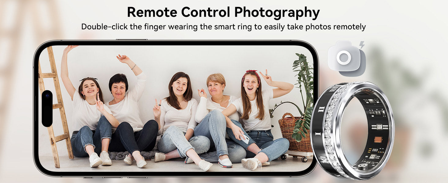 Our smart ring allows you to capture moments effortlessly with its remote photo control feature. Simply use the ring to take photos from a distance, making it perfect for group shots, hands-free selfies, or spontaneous moments.